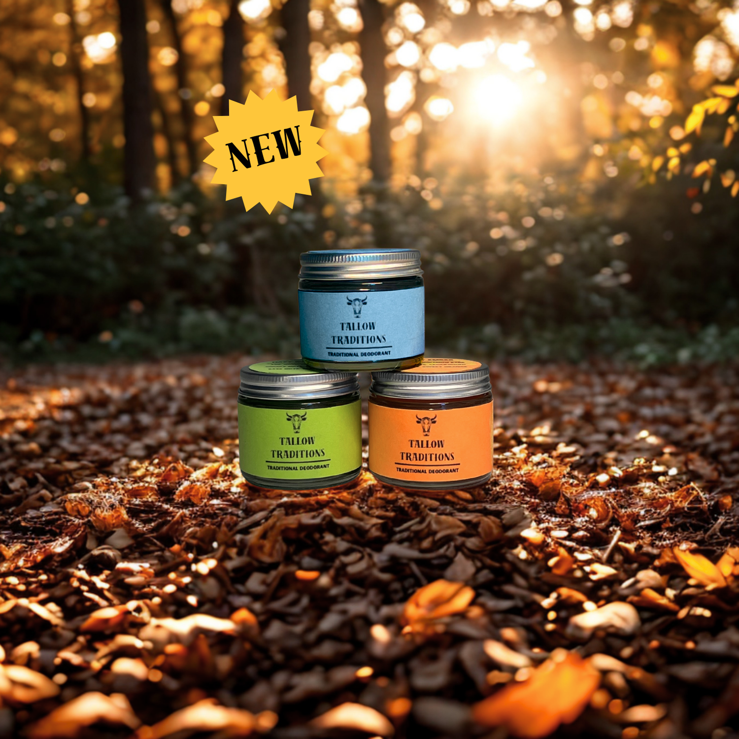 Stay fresh this Fall with our trio of all-natural, tallow-based deodorants. This bundle includes three signature scents - Hazy Meadow, Sweet Ember & frosted pine.